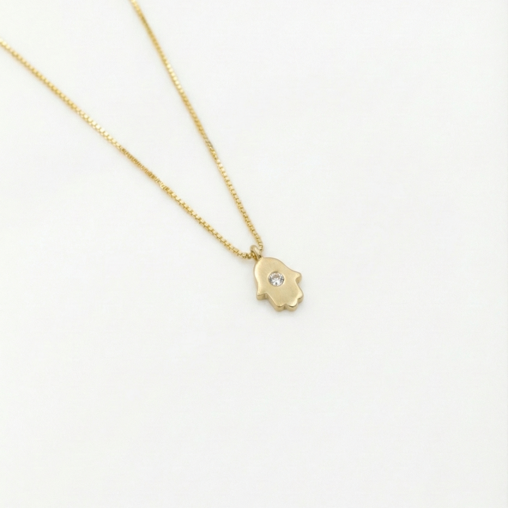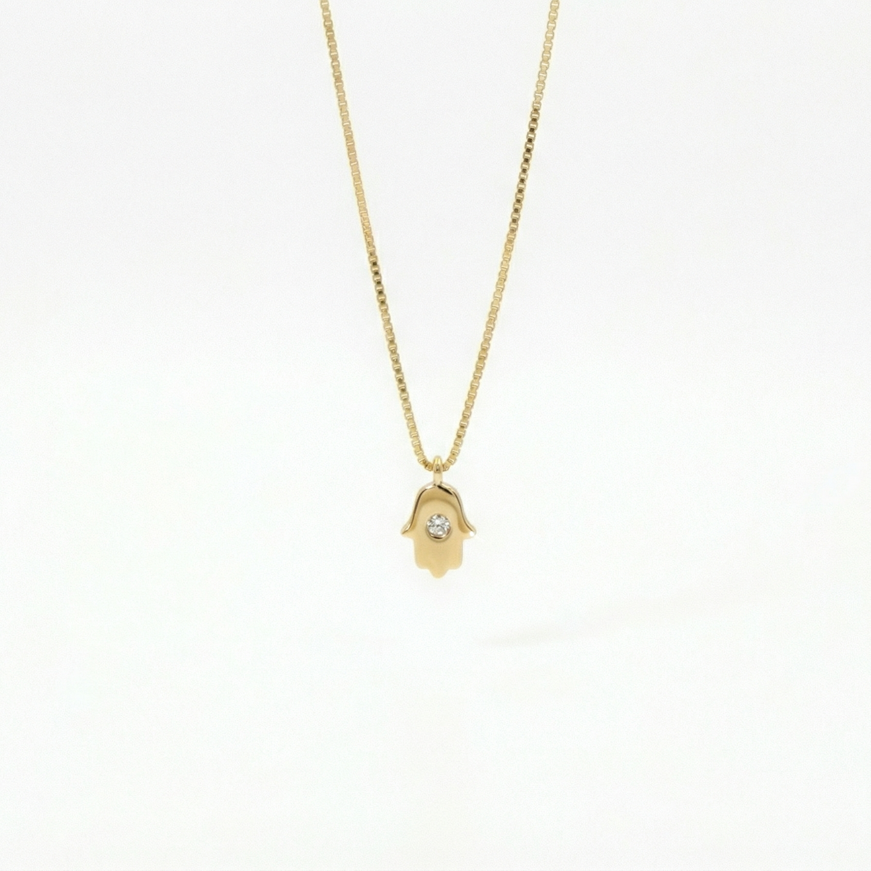 A 14 karat golf delicate and timeless piece, this necklace i features a small hamsa pendant, symbolizing protection and good fortune.