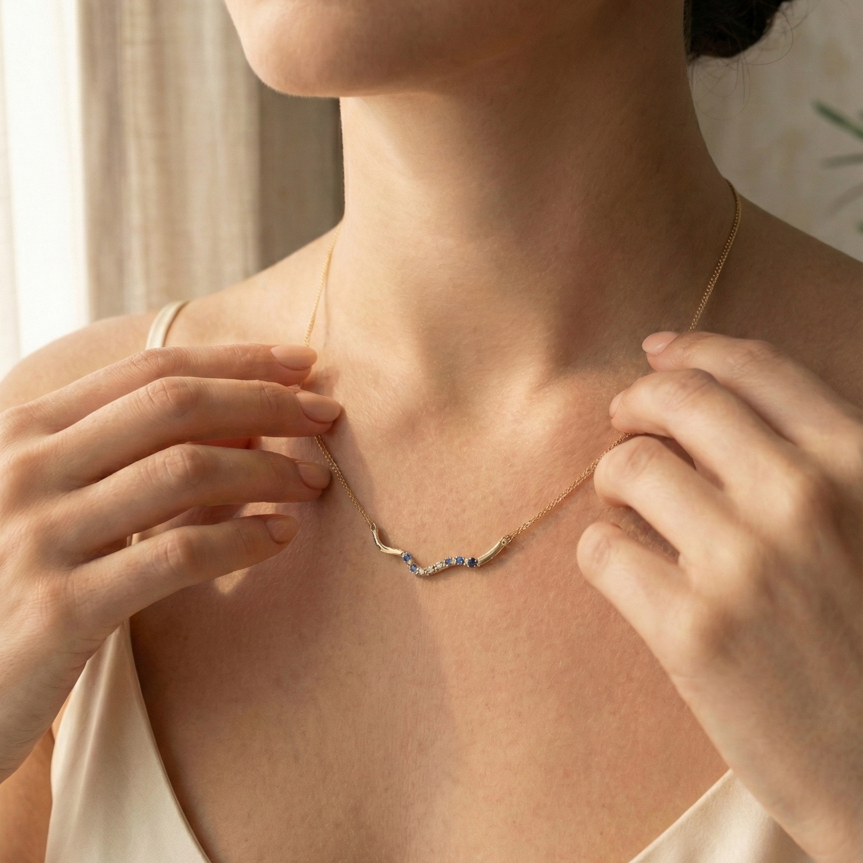 Made from 14K gold, the Layla Necklace features a unique wavy pendant set with seven blue sapphires in soft, ocean-inspired shades.